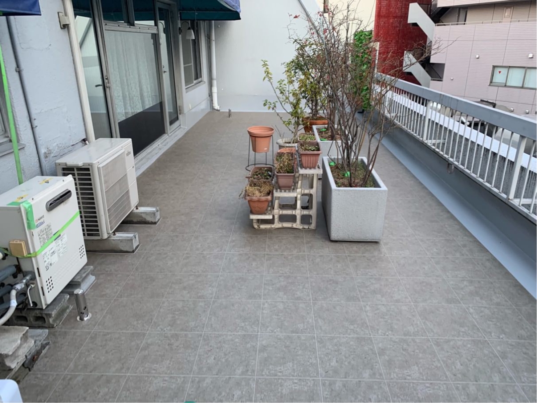 既存床タイル撤去の上、通気緩衝工法によるウレタン塗膜防水及び、塩ビシートによる仕上げにて実施。